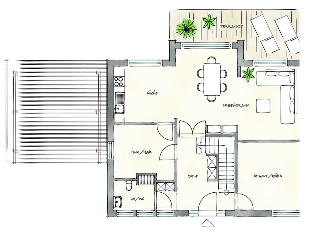 Es bietet sich oft als Alternative zum eher konservativen Satteldach an und verleiht Ihrem Haus ein moderneres Outfit. Holzapplikationen, Oberlichter und Eckverglasungen sind die weiteren Zutaten für ein harmonisches Erscheinungsbild.