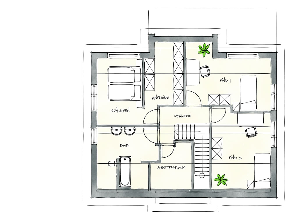 Auch das Innenleben kann natürlich wieder frei und individuell geplant werden. Damit aber alles funktional bleibt und nicht zu beengt wirkt, empfehlen wir hier eine Mindestgröße von 150 m² Wohnfläche. In unserem Entwurfs-Beispiel sind wir von der klassischen vierköpfigen Familie ausgegangen. Sollte sich aber später noch Nachwuchs ankündigen, kein Problem, dann steht immer noch das Gästezimmer im Erdgeschoss zur Verfügung.