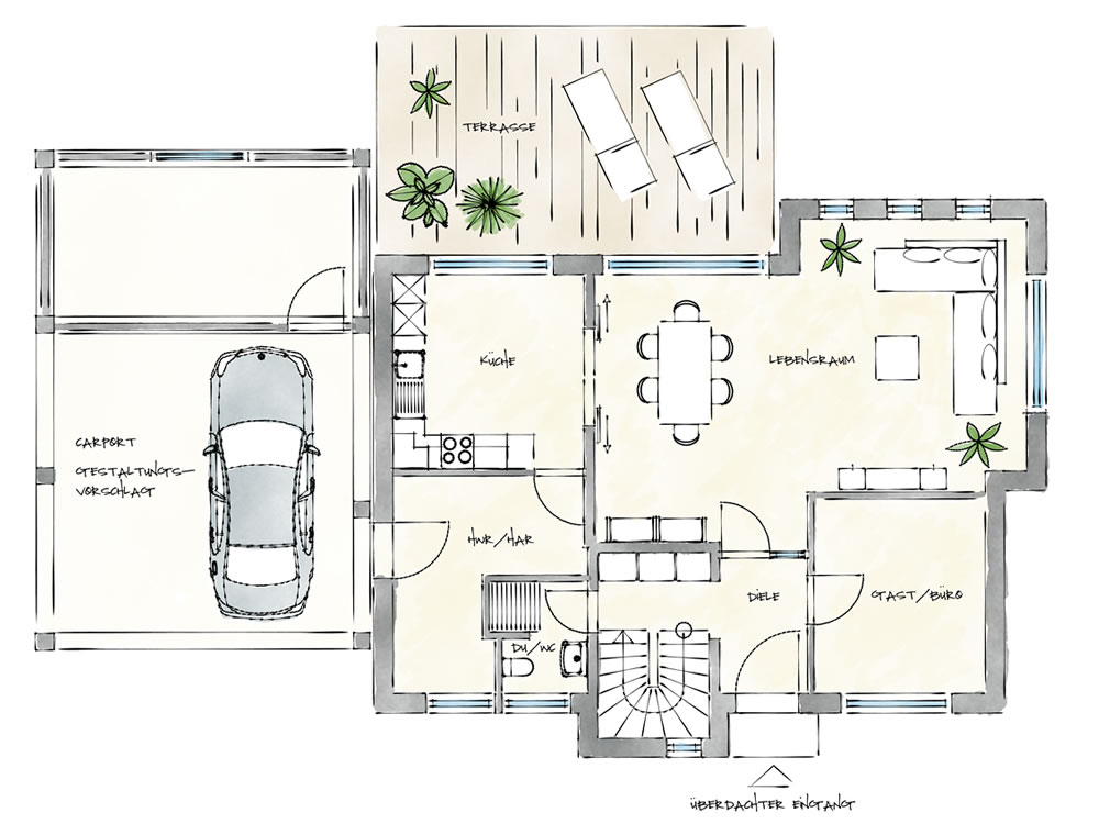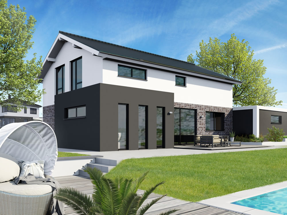 Die Wechselfassade aus Klinker, Putz und Farbabstufungen ermöglichen eine Vielzahl von Gestaltungsvarianten, die auch Ihrem individuellen Geschmack gerecht werden. Die Innenaufteilung überzeugt mit vielen praktischen Details: die Küche hat einen direkten Zugang zum Hauswirtschaftsraum, dieser wiederum hat einen direkten Zugang zum Carport bzw. zur Garage. Die Diele mit breiter Garderobennische ist sehr kompakt, aber nicht beengt. Dieses kommt der Wohnfläche zugute.