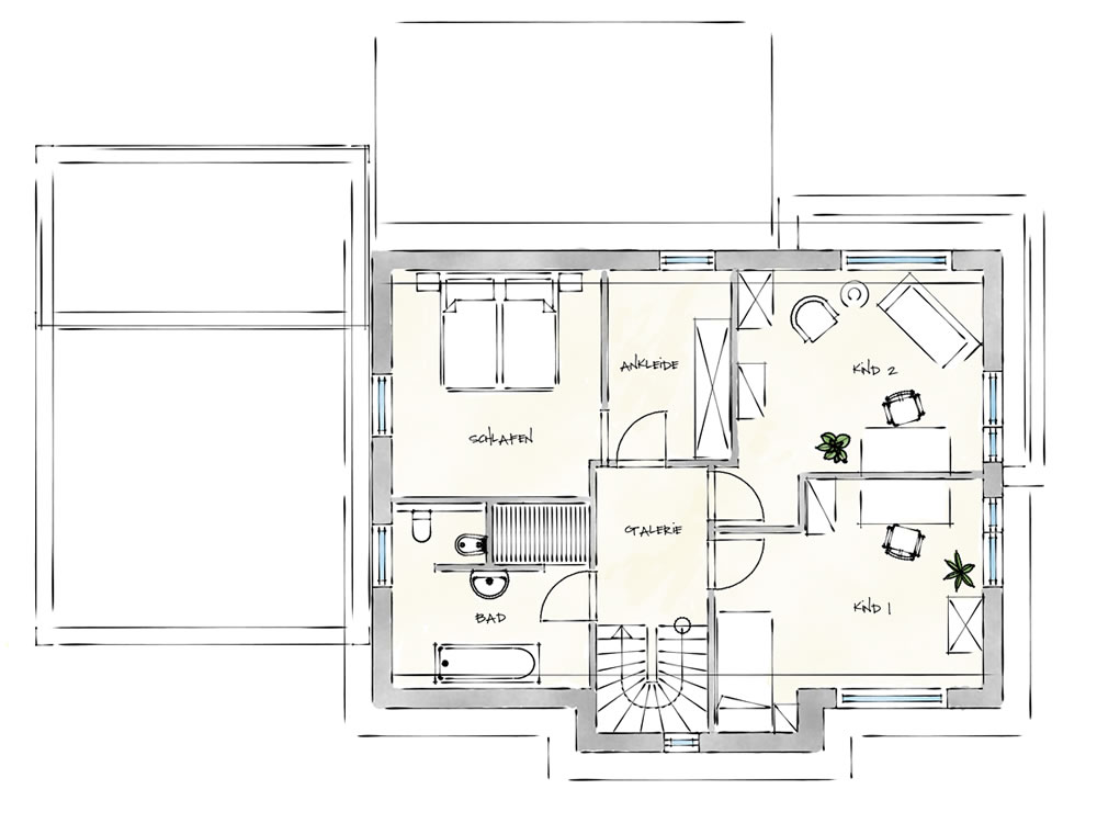 Der Lebensraum spricht durch seine Formgebung für sich und holt Ihnen durch die großen, bodentiefen Fensterelemente den Garten ins Wohnzimmer. Für den Gast ein eigenes Dusch-WC, für die Eltern eine Ankleide und das schmucke Wellnessbad benutzen alle gern.