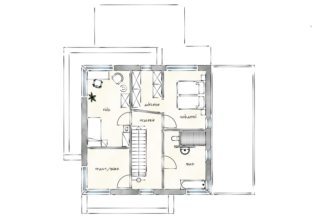 Funktional angeordnete Wohnbereiche, ein Hauswirtschaftsraum mit Verbindungstür zur Garage und die gradläufige Treppe sind wesentliche Gestaltungsmerkmale im Innenbereich. Der Flur im Obergeschoss ist gut belichtet und erschließt neben zwei Kinderzimmern mit Eckverglasung, das Elternschlafzimmer inklusive Ankleide und das großzügige Bad.